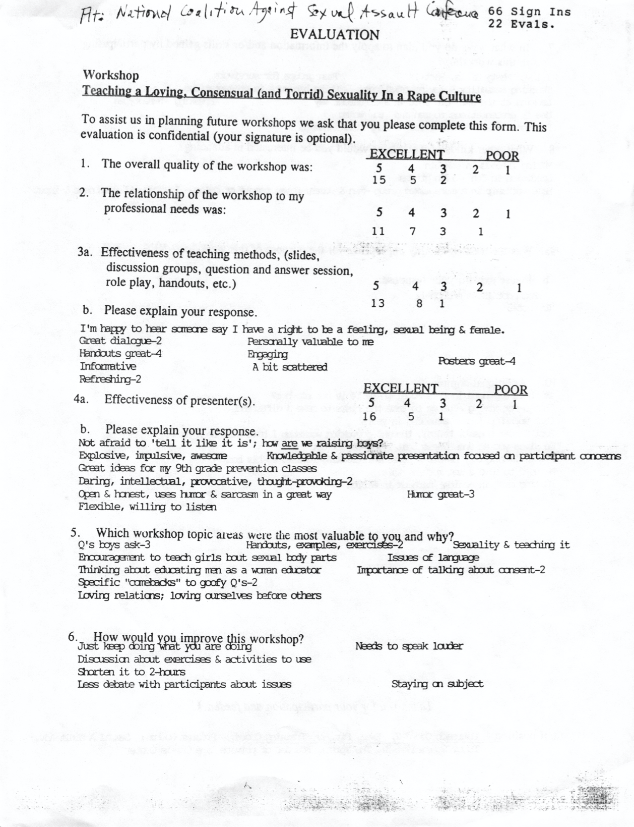 I led a four-and-a-half hour training at the 1997 National Coalition Against Sexual Assault Conference in New Orleans. Below is a summary of evaluations gathered and compiled by NCASA.